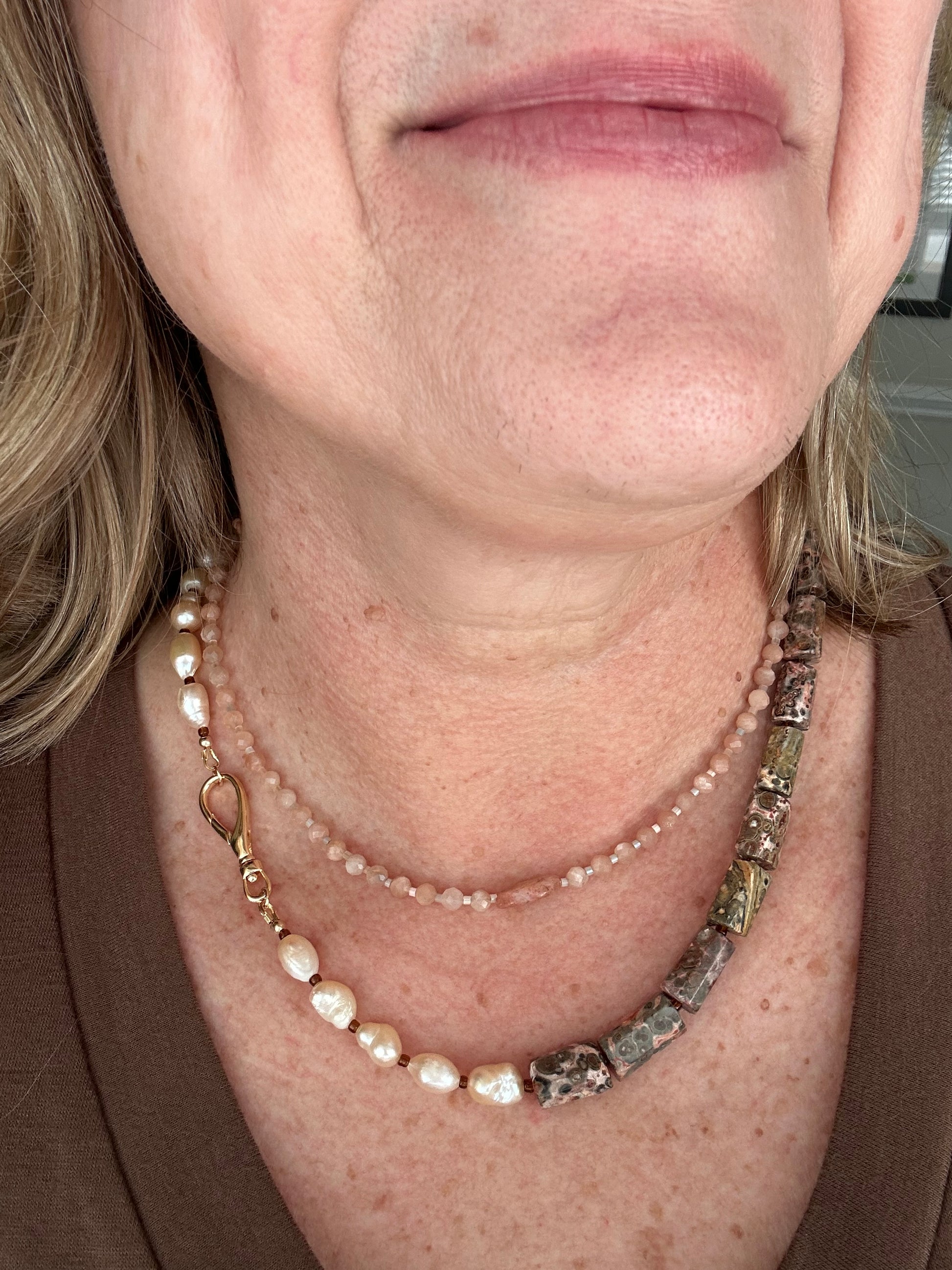 Blush Solace carries the gentle warmth of early morning — that quiet moment when the air is still and the light feels kind. Faceted peach moonstone beads give off a soft nude glow, while a sunstone focal adds a subtle warmth, like the first hint of sun slipping over the horizon.