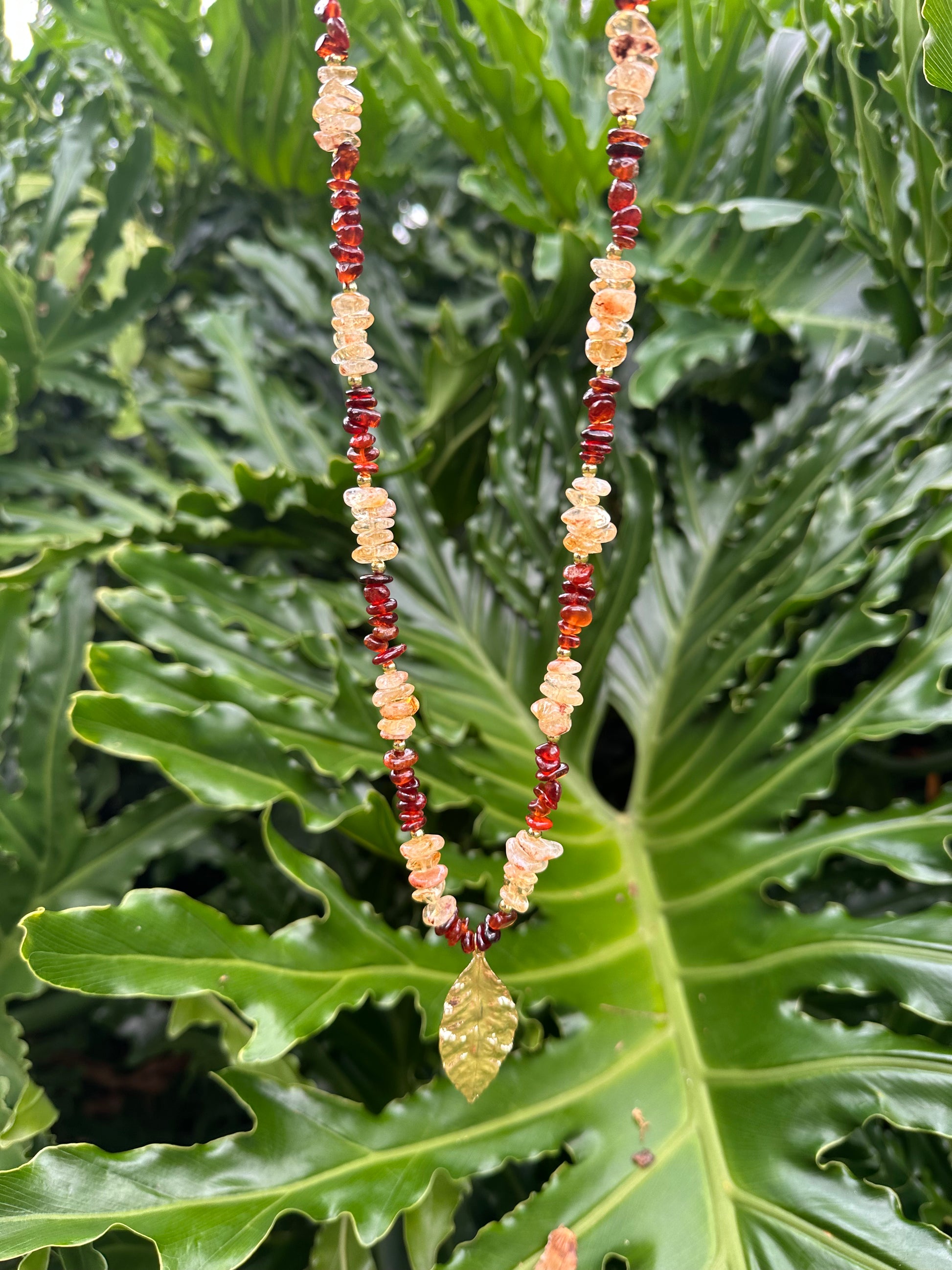 Citrine gemstone chips glow like captured sunlight, accented by deep garnet gemstone chips, golden accent beads, and a bold golden leaf pendant. This necklace embodies the golden shimmer of late afternoon light streaming through autumn trees. A radiant statement piece that reflects both strength and warmth.