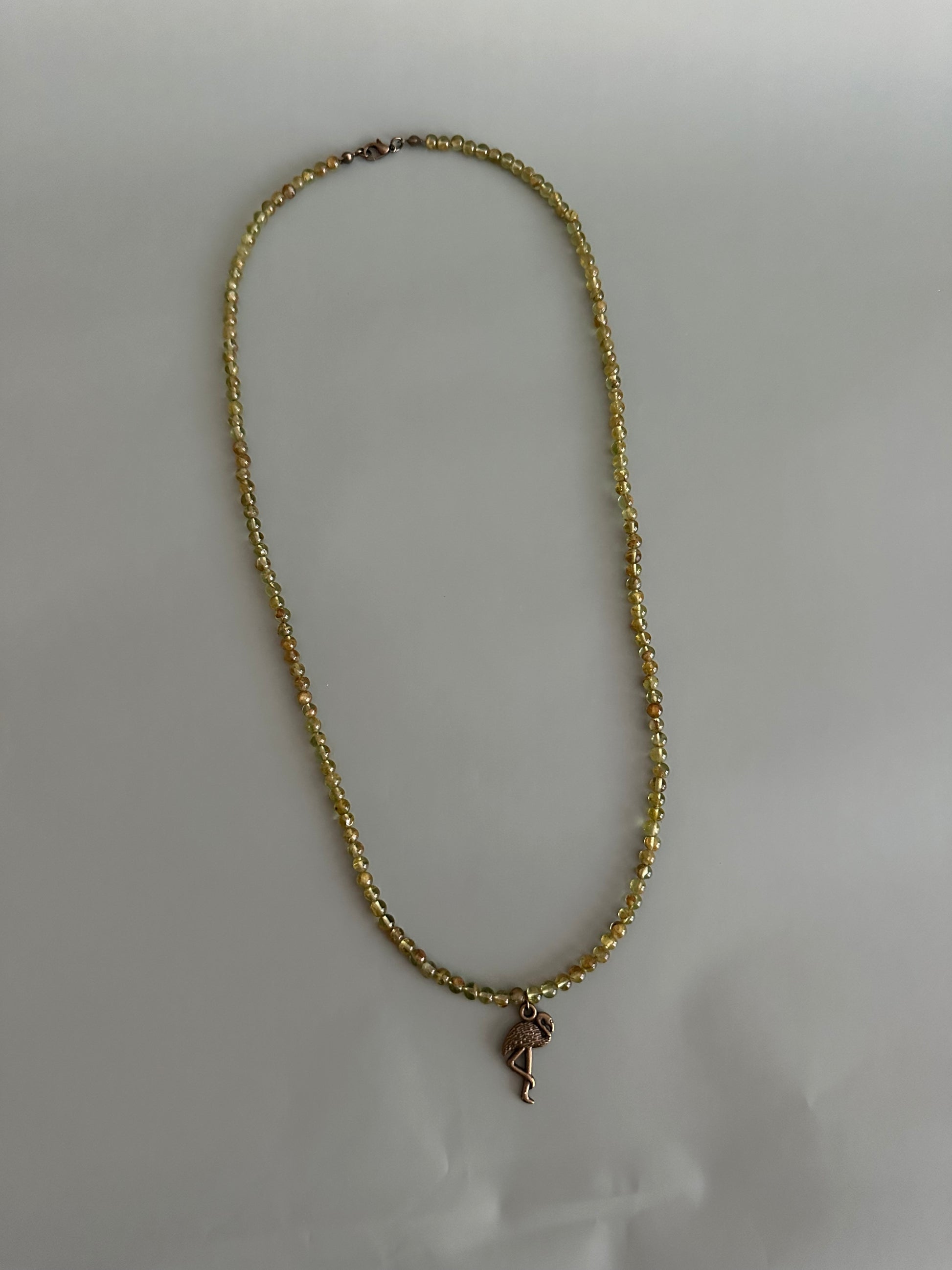Strung with small peridot beads in a soft, natural green, this necklace carries a calm, grounded presence rather than shine. An antique brass heron charm rests at the center, understated and symbolic, echoing patience, balance, and watchful calm along the water’s edge.