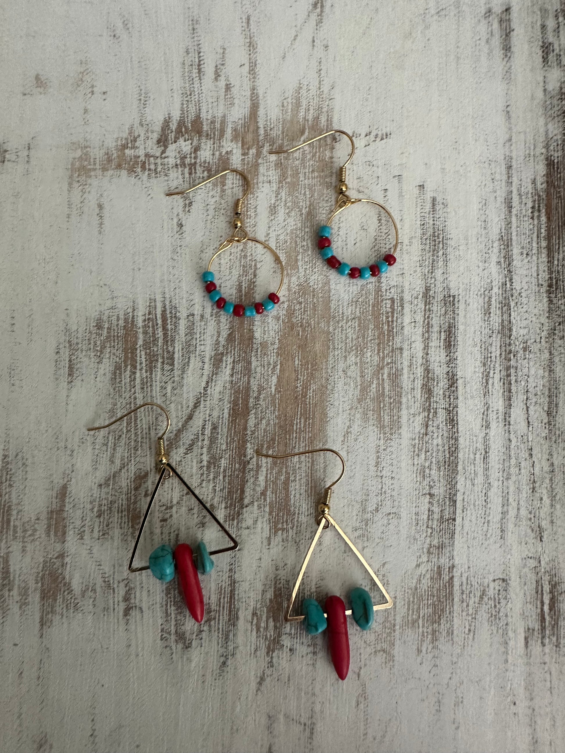 - Triangle style: 8mm turquoise chip stones + 16mm red dyed magnesite spike beads, approx. 1″ wide