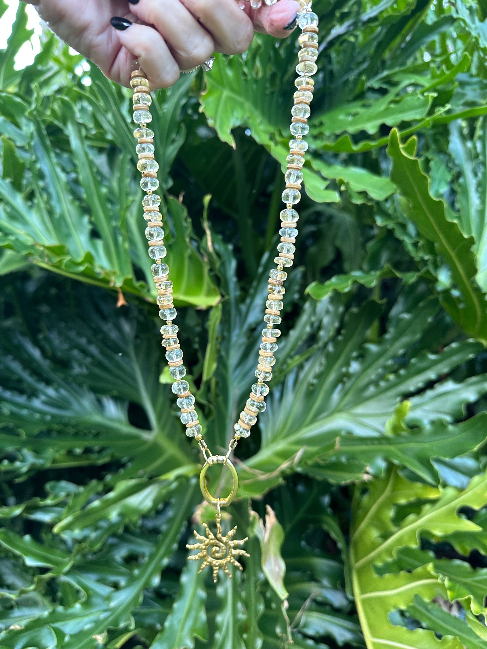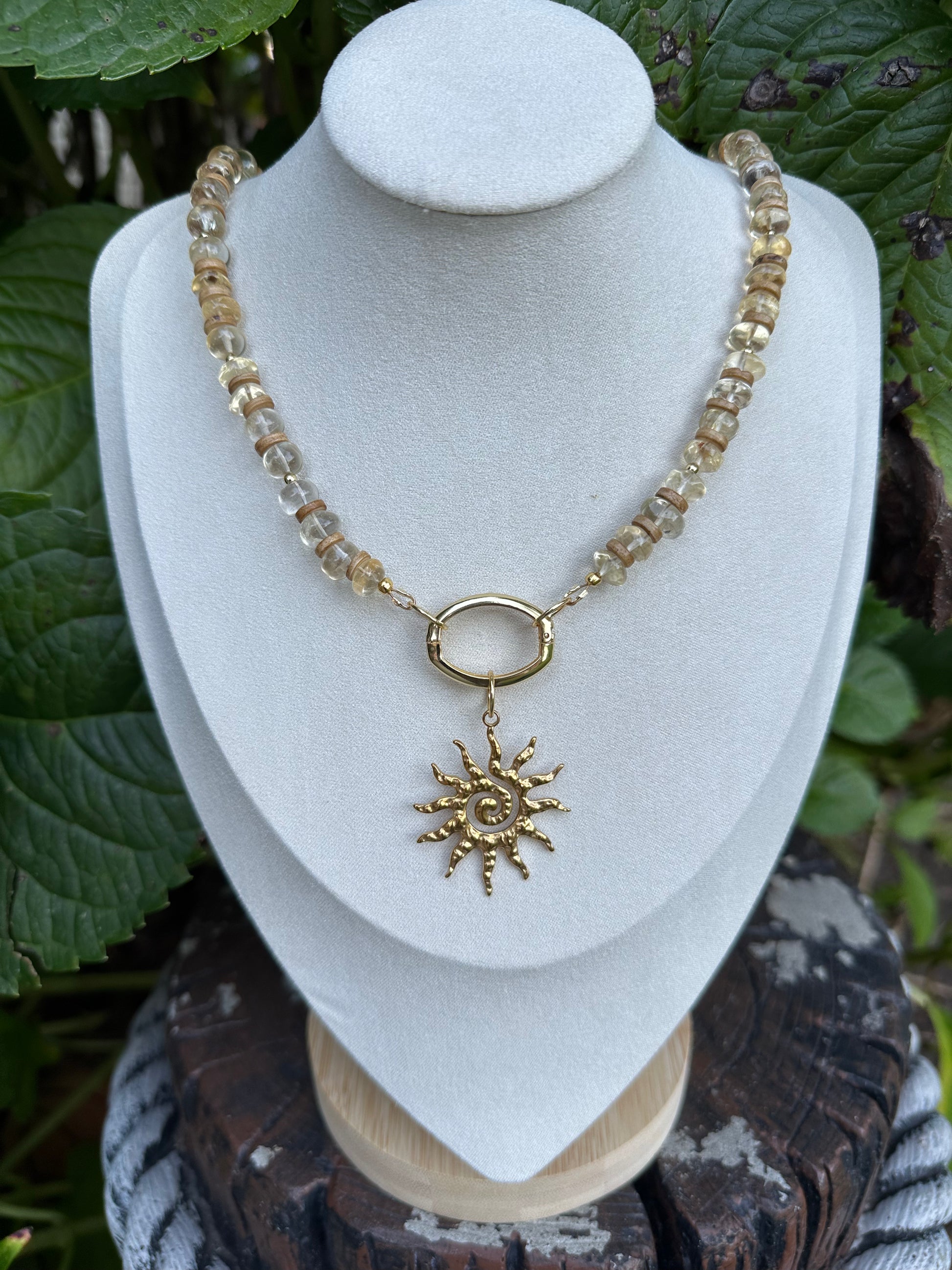 Sol Drift glows with the easy warmth of a golden Lowcountry afternoon. Citrine quartz beads shimmer like sunlight on calm waters, balanced by natural bone button beads and delicate gold accents that catch the light with every movement. At its center, a radiant sun pendant anchors the design — a reminder of days when the shore glows amber and the air hums with salt and warmth.