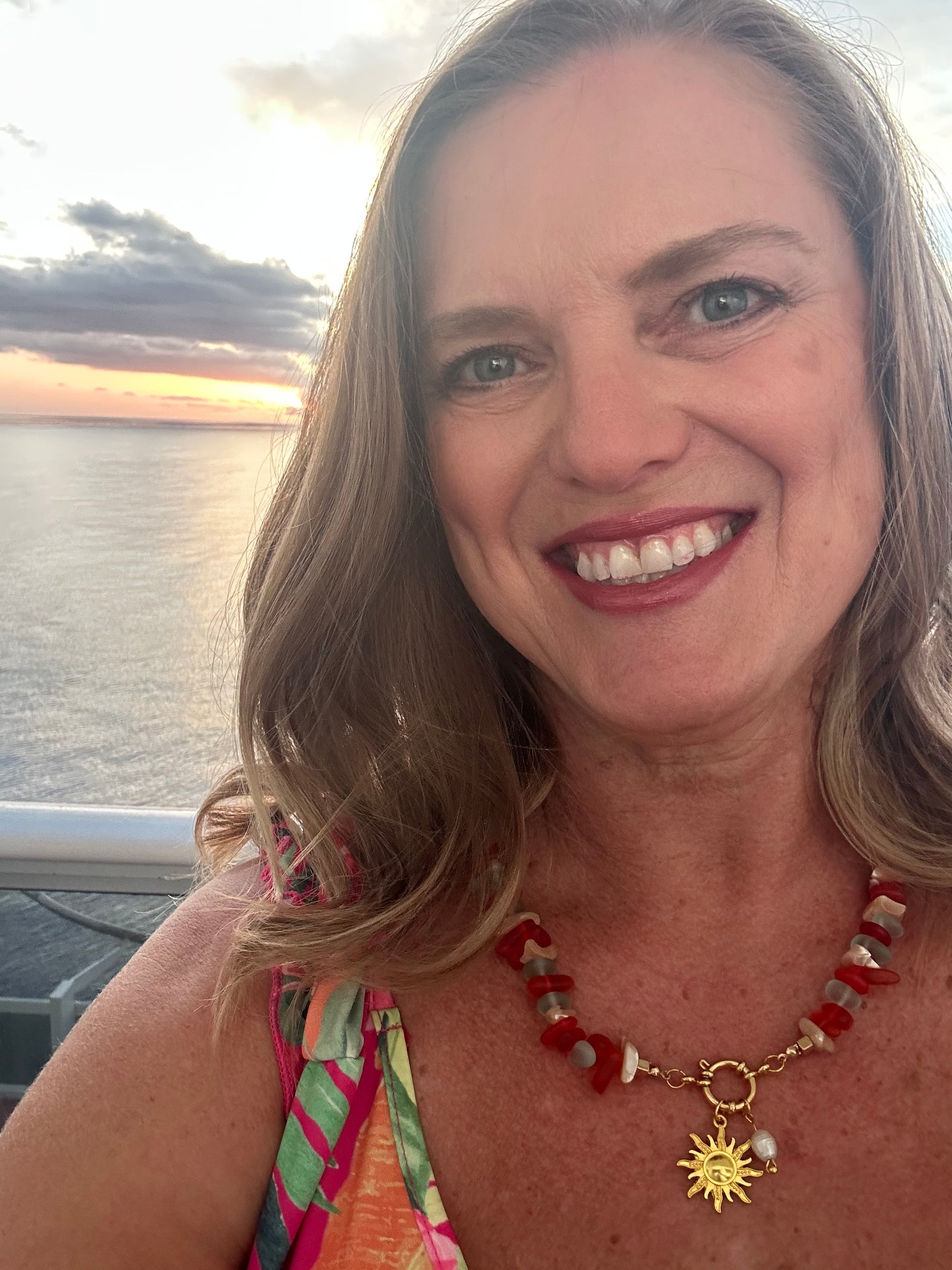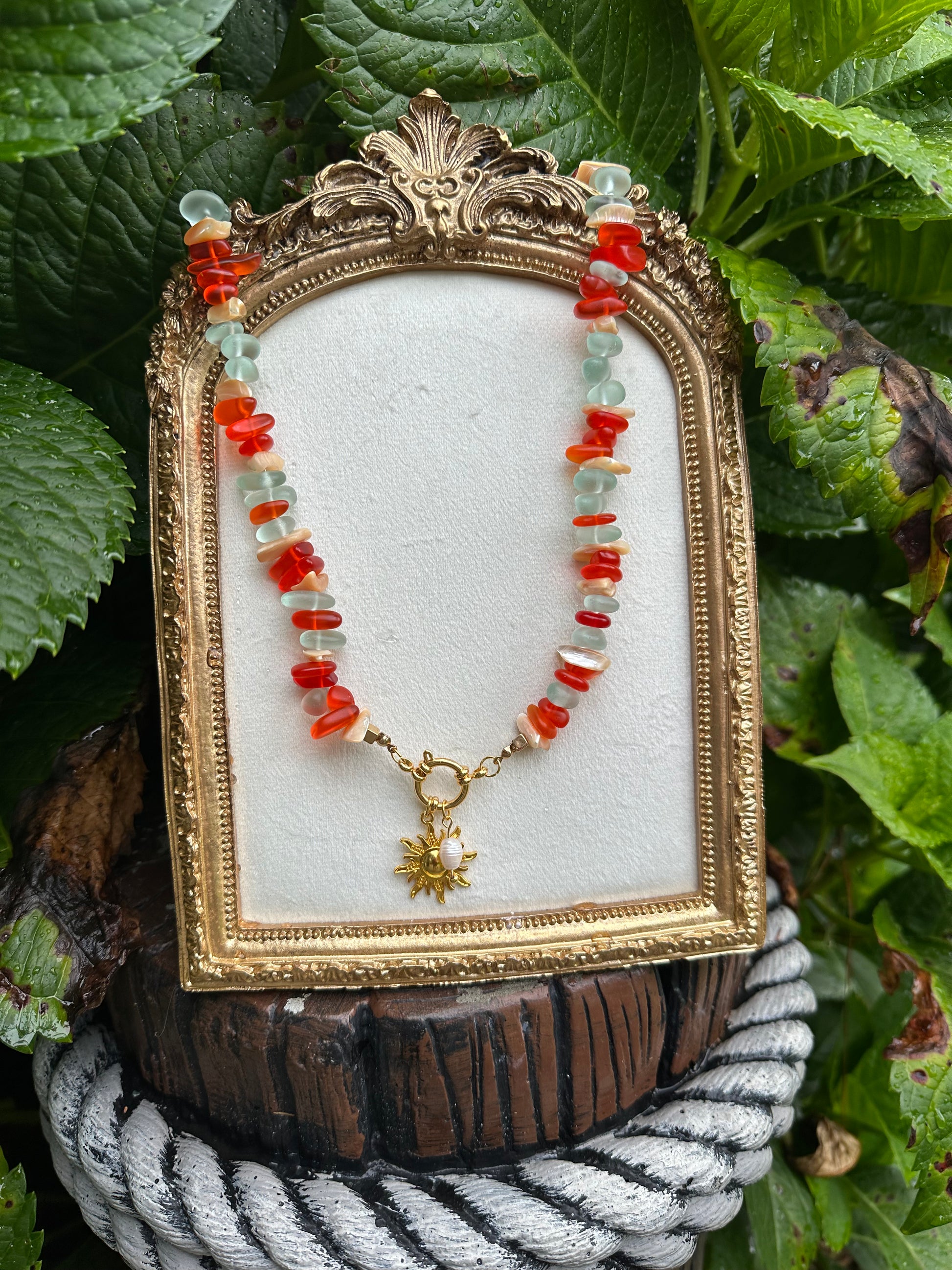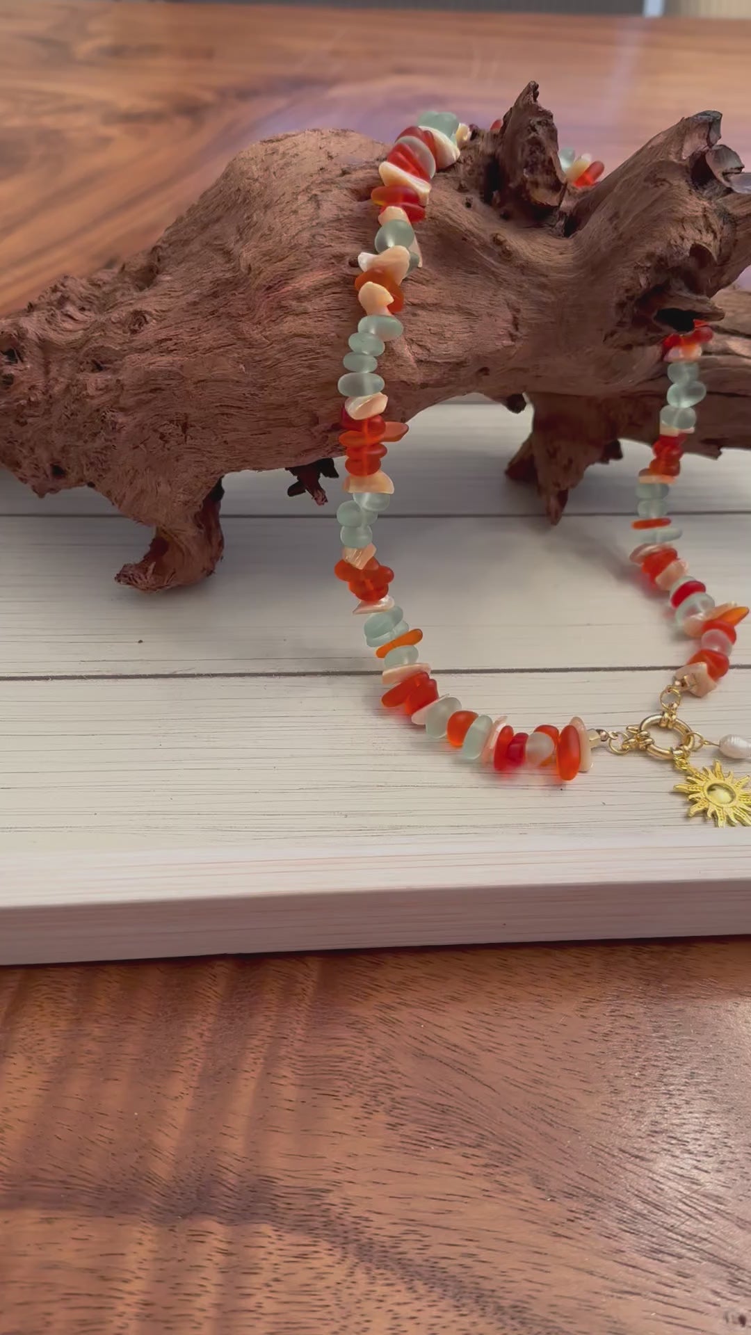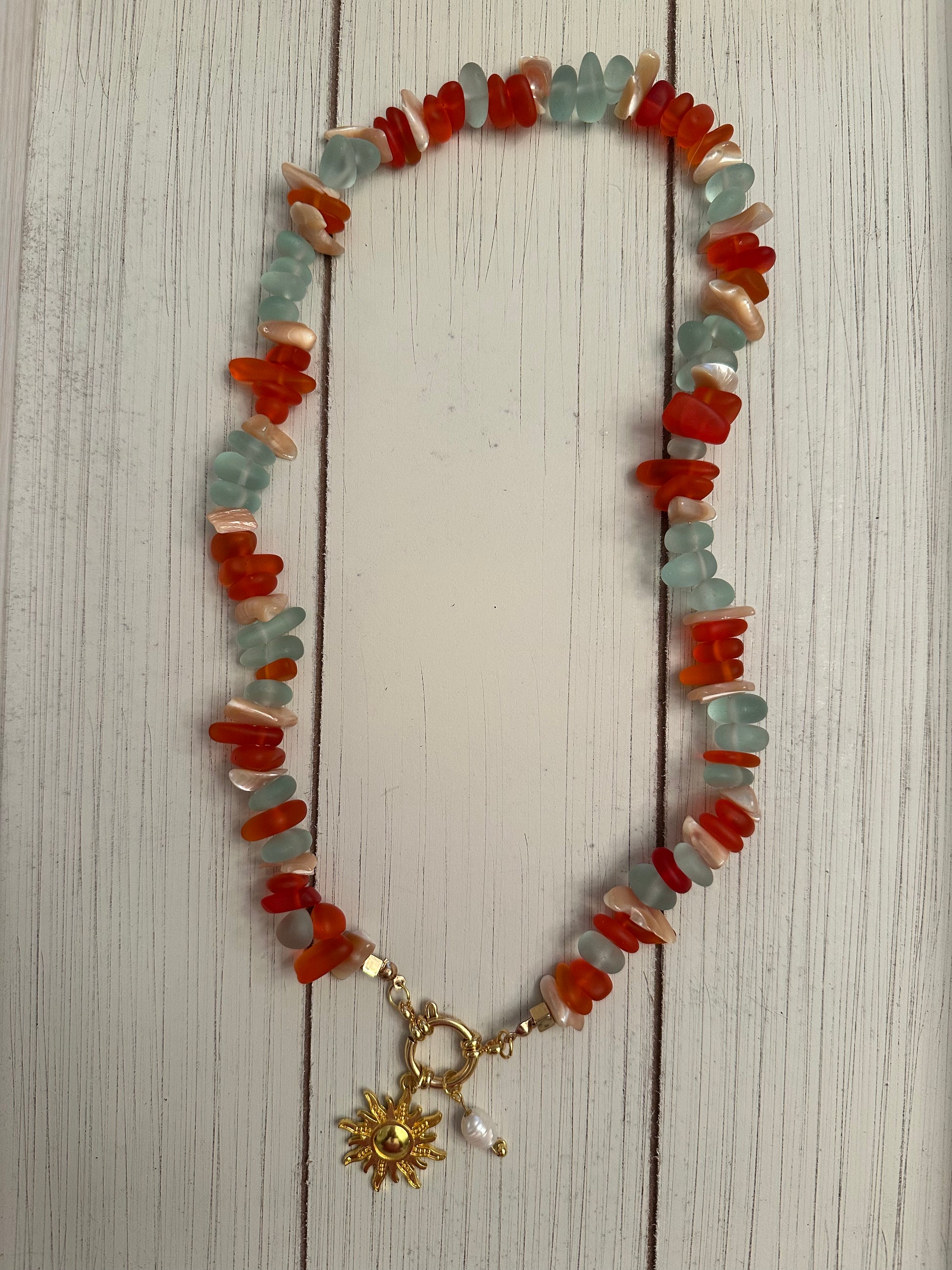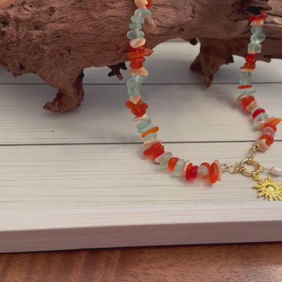 Sunset Beach glows with the colors of dusk along the water’s edge. Warm amber and coral tones mix with gold — recalling footprints in fading light and the hush of evening waves. A necklace that carries the calm and color of the coast at day’s end.