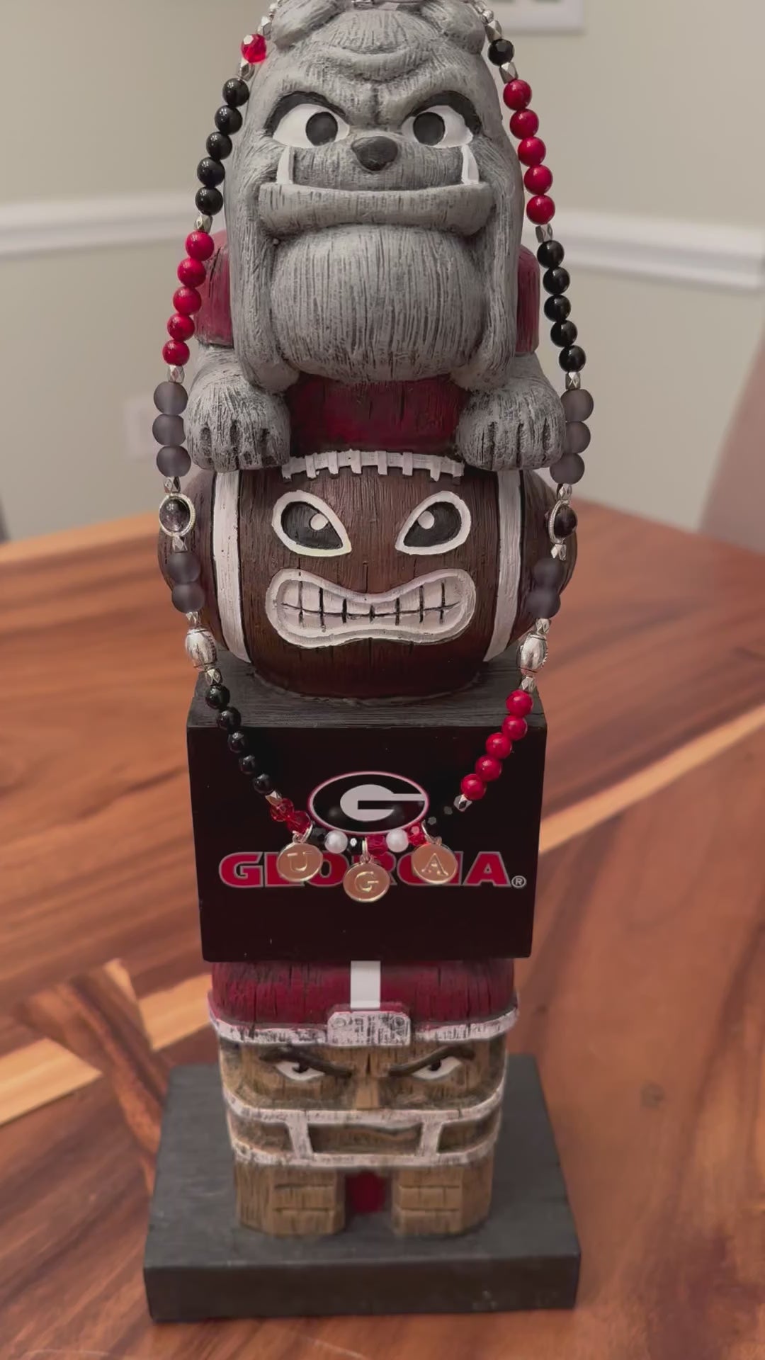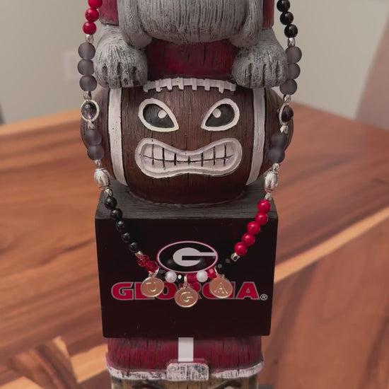 18" Georgia Bulldogs gameday necklace with 6mm red turquoise natural stone, 6mm black onyx agate, 8mm gray frosted glass beads, framed 8mm crackle glass accent beads, and approximately 3-4mm silver spacer beads. Stainless steel football accents. UGA dangle charms. carabiner clasps. Part of our Game Day Collection (SEC edition). Made to order. If you'd like matching earrings or a bracelet, I can make those as well. Support a different team? I've got you! Send an email to us with your preferred team.
